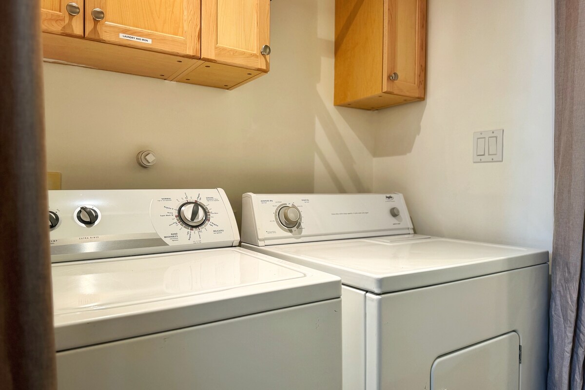 LAUNDRY: Full-size washer and dryer with detergent, dryer sheets, and handheld steamer.
